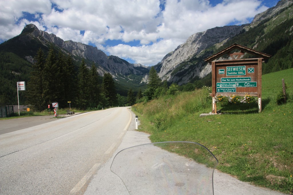 Wie immer ging es auf eher kleinen kurvigen Straßen hinaus aus Enzesfeld und Richtung Aigen bei Hernstein und von dort über den Hart im größten zusammenhängenden Schwarzföhrengebiet Mitteleuropas. Hier begann bereits der Fahrspaß, denn solche Serpentinen vermutet man nicht so nahe der Bundeshauptstadt Wien. Die Straße brachte uns hinunter ins Piestingtal, das nicht nur bei Motorradfahrern, sondern genauso bei Wanderern und Radfahrern beliebt ist.