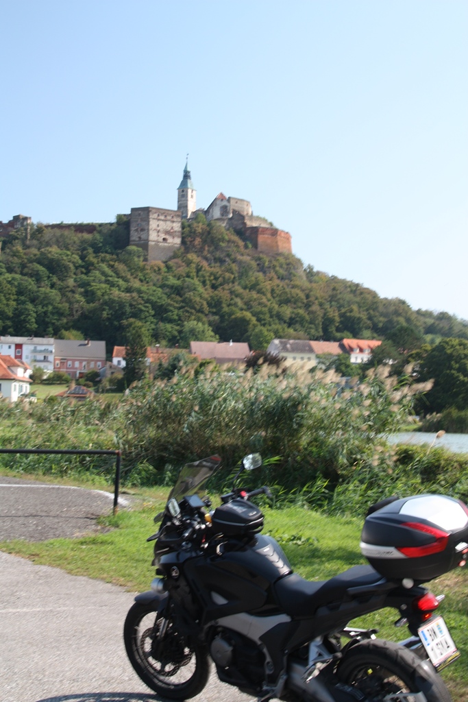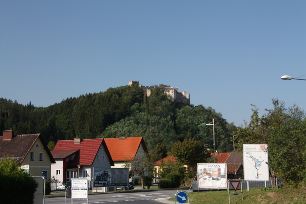 Ich habe das bereits vor einigen Jahren gemacht, drum genieße ich ohne weiteren Stopp die schönen Kurven hinunter nach Lockenhaus. Von dort brachte mich die B55 über Bad Schönau und Krumbach mit seiner Burg bis Grimmenstein, dessen Burg hier auch fehlt.