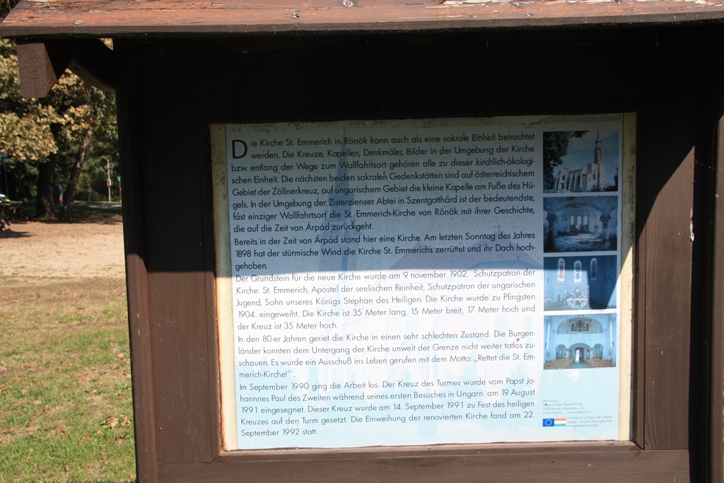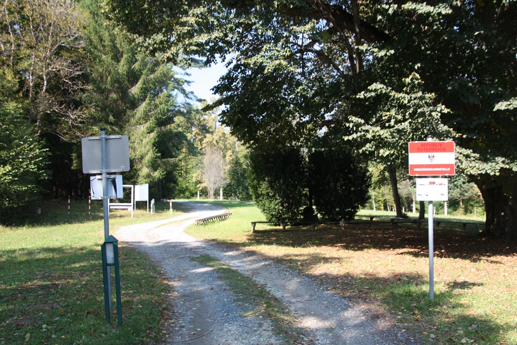 Über Kleinmürbisch fuhr ich dann durch Inzenhof und weiter auf einem Feldweg, der schließlich in einen kilometerlangen Schotterweg durch den Wald überging, bis ich Google Maps zusätzlich neben dem Navi konsultierte, ob der Weg noch richtig sei. Es war richtig und nach einem weiteren Kilometer öffnete sich der Wald und nach einem kleinen Parkplatz stand ich direkt an der Grenze und dahinter lag die schon erwähnte Kirche, die Wallfahrtskirche St.Emmerich.