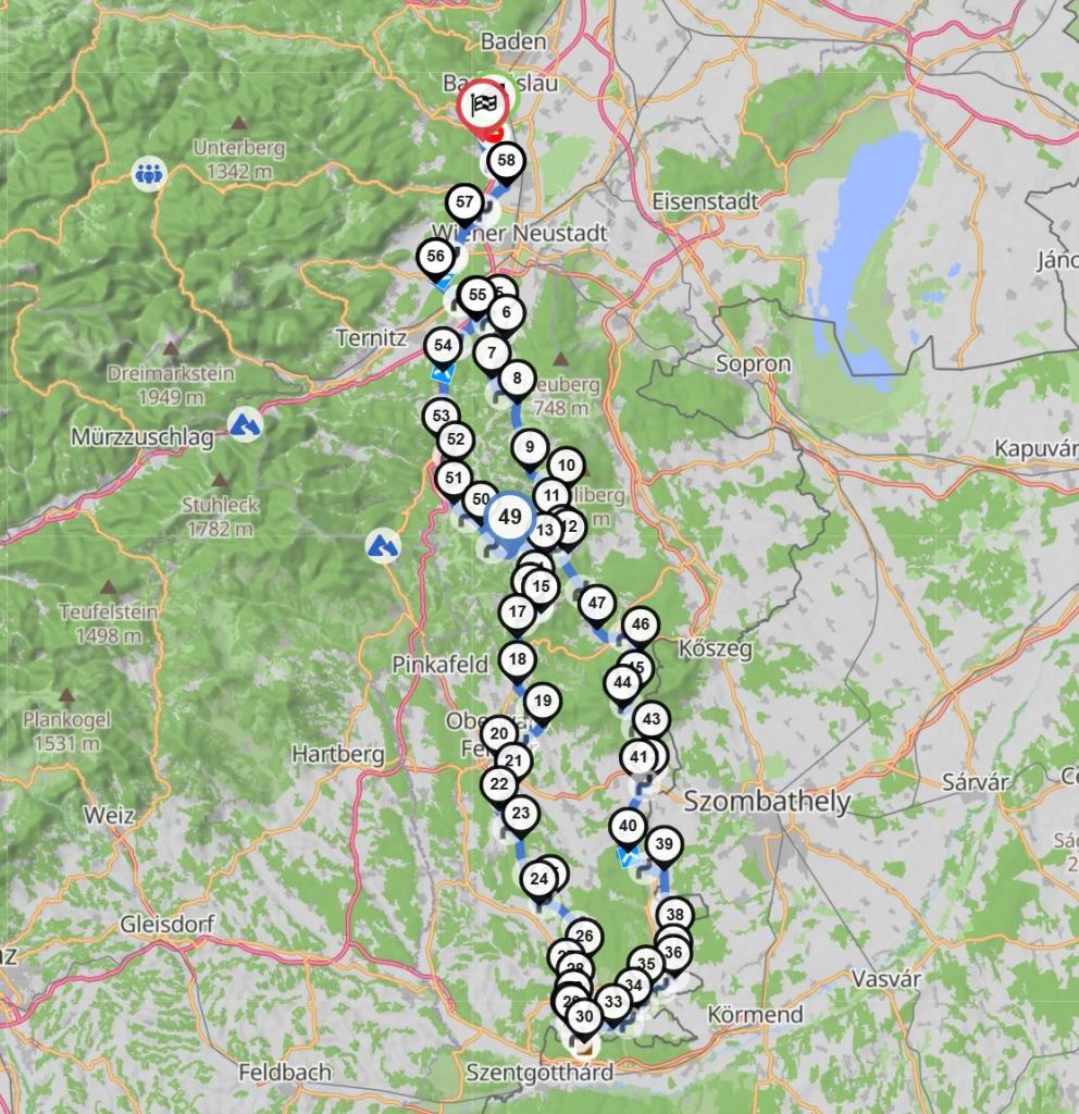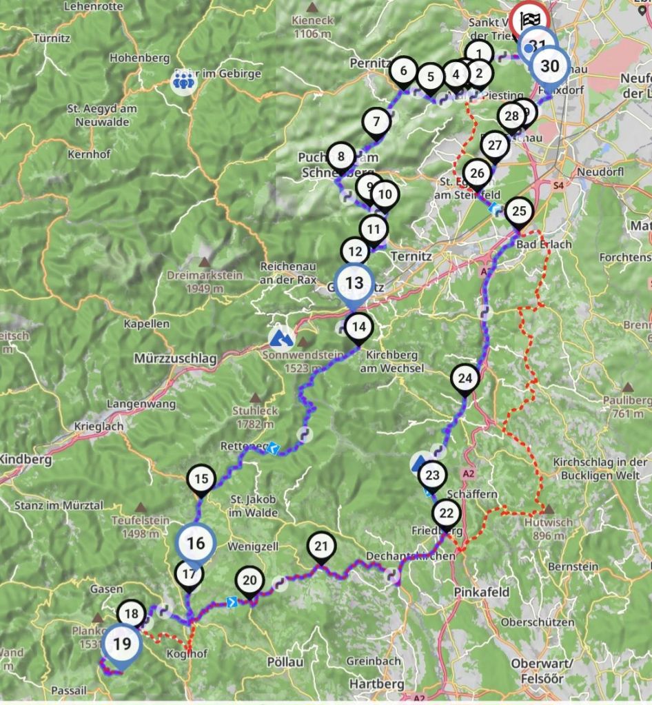 Die Fahrt zurück hatte ich ursprünglich nach Birkfeld und Vorau noch durch die Bucklige Welt geplant. Nachdem uns aber bald nach der Abfahrt der Regen ordentlich durchnässte, kürzten wir den Rückweg ab und fuhren auf der Wechselbundesstraße B54 direkt bis kurz vor Wr.Neustadt, wo uns nochmals der Regen erwischte und wir auch den Abschlusskaffee ausfallen ließen, weil jeder von uns froh war, die nasse Motorradkluft los zu werden.
