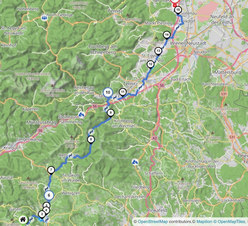 Der Rückweg führte uns wieder hinunter bis Birkfeld und dann weiter über die B72 ins Joglland bis Ratten und Rettenegg und dann den Feistritzsattel hinauf und zurück nach Niederösterreich ins Wechselgebiet. Nach Trattenbach und Otterthal ging es vorbei an der Burg Wartenstein nach Gloggnitz zu einer abschließenden Kaffeepause.