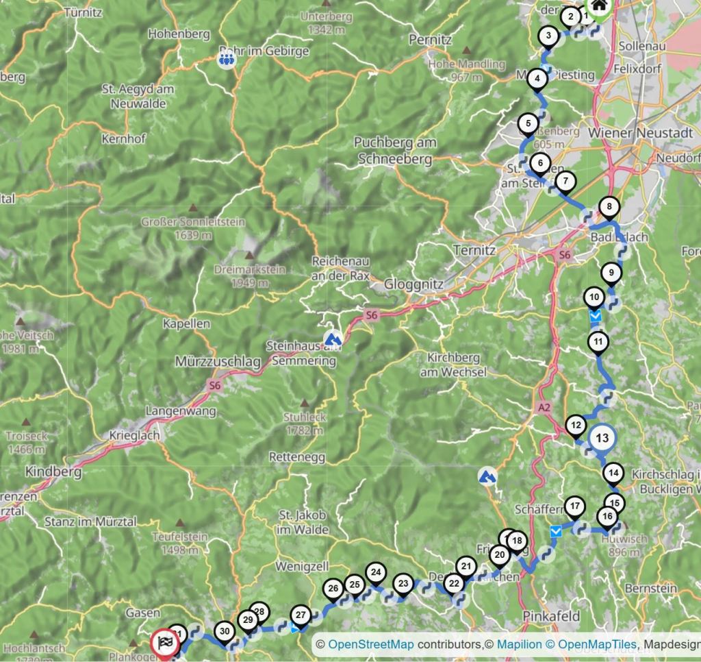 Zum Heimweg entschieden wir uns, etwas abzukürzen und statt über Puchberg am Schneeberg einfach über die B17 bis Neunkirchen und dann die Blätterstraße nach Bad Fischau und über Steinabrückl und Matzendorf zu fahren. So ging dann eine angenehme 300km-Runde gemütlich zu Ende.
